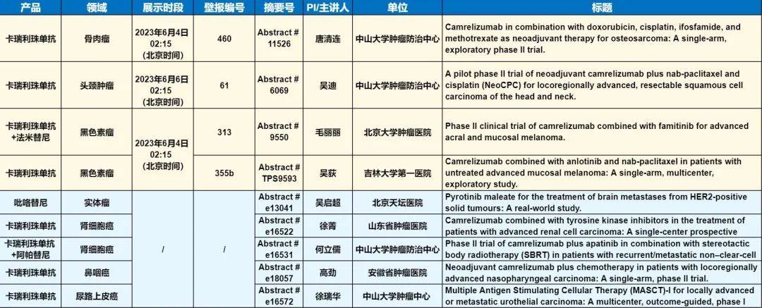 此外,在头颈肿瘤、黑色素瘤、骨肉瘤、鼻咽癌、肾细胞癌、尿路上皮癌等多个领域,卡瑞利珠单抗、吡咯替尼等产品相关研究一共入选了4项壁报展示和5项线上发表,彰显了永利娱乐城医药强大的自主研发综合实力。
